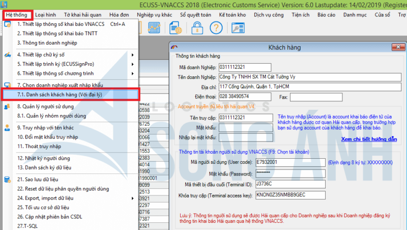 Sau đó bạn vào “Hệ thống”. Chọn “7.1 Danh sách khách hàng (với đại lý)” để nhập thông tin doanh nghiệp và Thông tin tài khoản người sử dụng VNACCS (hay còn gọi là bộ tài khoản VNACCS).