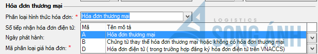 Phân loại hình thức hóa đơn: có 3 sự lựa chọn, thông thường hàng kinh doanh có hóa đơn thương mại thì bạn chọn A