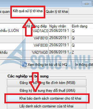 Tab “Kết quả xử lý tờ khai” > chọn “Khai báo danh sách container cho tờ khai”