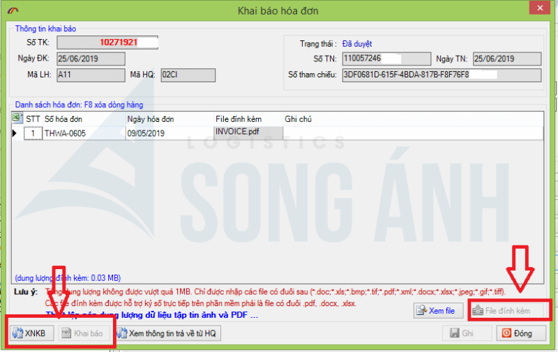 Ví dụ: bạn cần khai hóa đơn thương mại thì tại mục hóa đơn thương mại bạn chọn vào Chọn “File đính kèm” để đính kèm hóa đơn vào chọn khai báo để khai báo đến cơ quan hải quan chọn “XNKB” cho đến khi nào trạng thái trở thành đã duyệt, bạn đã khai báo hóa đơn thương mại thành công