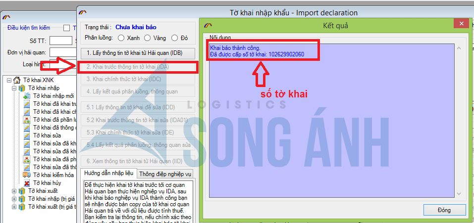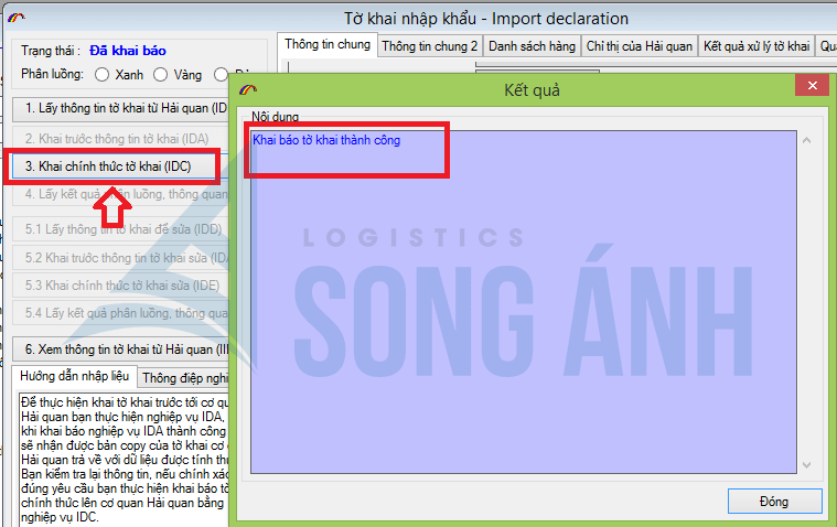 Tiếp theo bạn chọn tiếp: 3. Khai chính thức tờ khai (IDC) > hệ thống sẽ trả về kết quả khai báo thành công