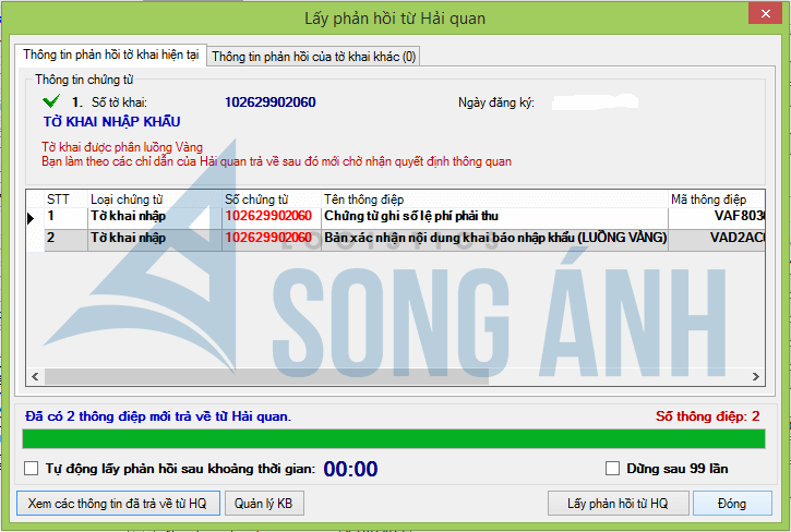 Tiếp theo bạn chọn 4. Lấy kết quả phân luồng, thông quan: hệ thống sẽ thông báo luồng tờ khai như hình dưới đây, có nghĩa là bạn đã khai tờ khai thành công