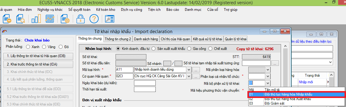 Mã bộ phận xử lý tờ khai: khai tờ khai nhập khẩu thì bạn chọn 01 – Đội thủ tục hàng hóa nhập, tương tự trong trường hợp khai tờ khai xuất khẩu thì bạn chọn 02 – Đội thủ tục hàng hóa xuất khẩu