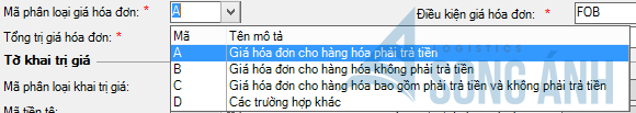 Mã phân loại giá hóa đơn: có 4 sự lựa chọn, tùy vào trường hợp thực tế của doanh nghiệp mà bạn lựa chọn cho phù hợp. Ví dụ hóa đơn thương mại hàng kinh doanh phải thanh toán thì bạn chọn A – giá hóa đơn cho hàng hóa phải trả tiền.