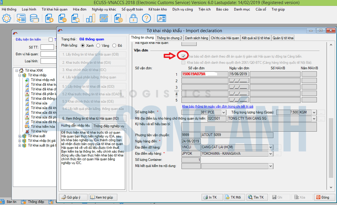Hoặc hàng chuyển tải, ví dụ hàng từ U.S về VN đi trên 2 con tàu khác nhau, đầu tiên từ Cảng Savanah đi trên tàu MAERSK 019S sau đó chuyển tải tại Hongkong chuyển sang tàu HEUNG A 015N để về Cát Lái thì khi đó bạn sẽ khai tên tàu số chuyến là HEUNG A 015N.
