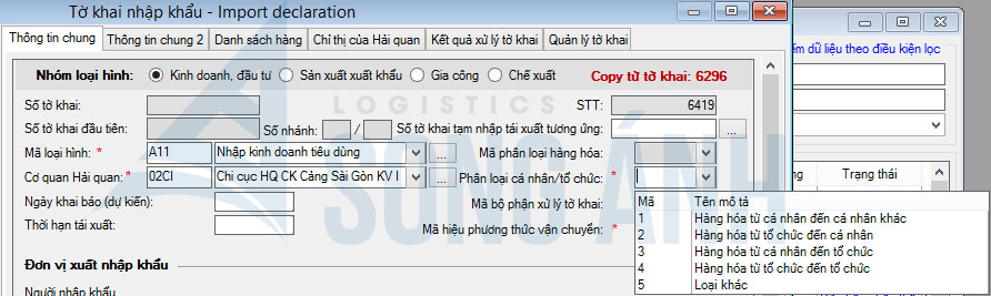 Phân loại cá nhân/tổ chức: bạn chọn mũi tên xuống bên cạnh, hệ thống sẽ hiện ra 5 loại để bạn lựa chọn như hình bên dưới, thông thường chúng ta sẽ khai tờ khai hải quan đối với các doanh nghiệp trao đổi, mua bán với nhau nên thường sẽ chọn số 4 – Hàng hóa từ tổ chức đến tổ chức.