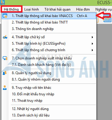 Bạn vào “Hệ thống”, chọn 1. Thiết lập thông số khai báo VNACCS để thiết lập thông số VNACCS cũng như chọn đúng chi cục hải quan bạn sắp khai báo tờ khai hải quan